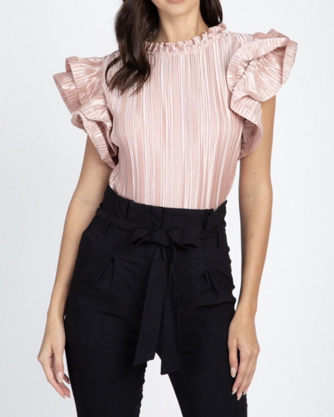A woven top featuring an accordion pleat construction, short tiered ruffle sleeves.